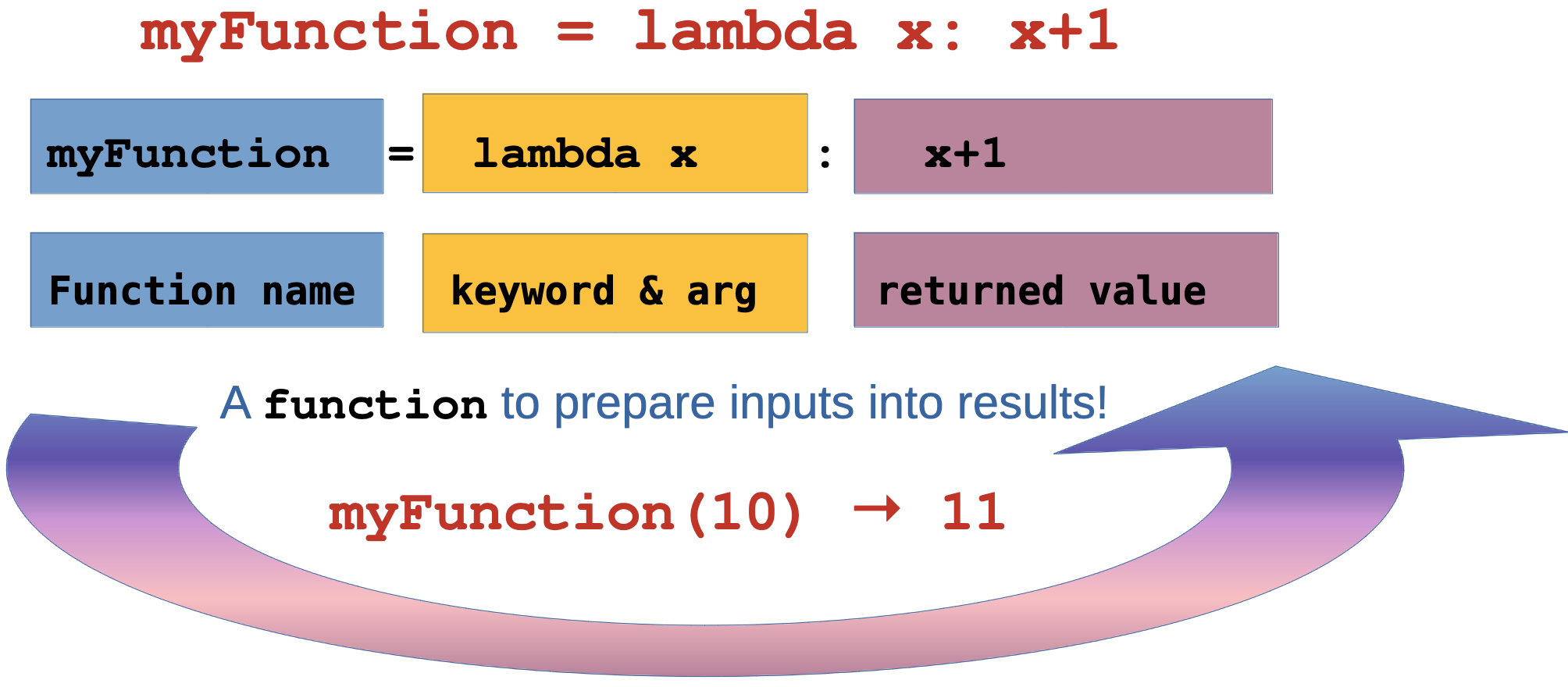 def myFunction():Key Point: Lambda functions are expressions, not statements - they return a value immediately!